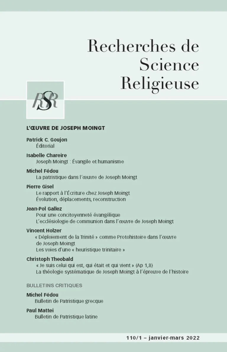 L’article met en relief la succession des trois ensembles de théologie systématique de Joseph Moingt, labourant un même terrain, ce qui pose donc la question sur les raisons d’être de ces « reprises ». De nombreux éléments textuels par lesquels l’auteur entre en dialogue avec ses lecteurs permettent une réponse. Ils révèlent les évolutions de la recherche théologique d’une cinquantaine d’années qui, greffées sur les mutations de l’Église et des sociétés européennes, se cachent dans son œuvre systématique et l’exposent, en sa forme de totalité unifiée, au test par l’histoire. L’enquête commence par l’examen du « genre littéraire » bien singulier de cette dogmatique catholique dans le contexte des théologies systématiques du XXe siècle. Elle se poursuit par une analyse détaillée des dialogues « interstitiels » de l’auteur avec la recherche et ses lecteurs, s’intéressant aux deux principales mutations épistémologiques intervenues lors de ce long parcours. Elle se termine par la difficile question de la réception de cette œuvre : quelle pertinence garde-t-elle dans la conjoncture actuelle de nos sociétés européennes et de nos Églises ? Sa structuration systématique résiste-t-elle à la non transparence du « réel », à la pluralité des cultures sur notre terre et à la fragmentation de nos savoirs ? Est-elle sensible aux événements individuels et collectifs qui se produisent au sein de nos sociétés ?