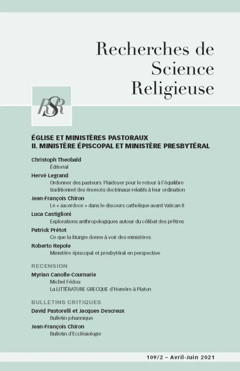 La crise des ministères pastoraux dans l’Église catholique en Europe, telle qu’elle a été décrite et analysée dans le premier numéro de ce dossier (RSR 109/1 [Janvier-Mars 2021], suscite et nécessite – comme toute crise – des considérations historiques sur son « avant » et, si possible, sur un « après ». La théologie ne peut donc aborder la situation actuelle et l’avenir des ministères sans recourir aux travaux des historiens, voire se faire elle-même histoire critique des configurations successives de la ministérialité ecclésiale au sein d’une longue tradition pluriforme. Ainsi doit-elle débusquer des légitimations idéologiques sans fondement, détecter des compromis et des « bricolages », expliciter les liens entre des discours doctrinaux tenus pour pérennes et des réalités sociales dépassées qui les sous-tendent ; tout cela pour chercher positivement ce qui est « normatif », toujours intrinsèquement lié à un contexte et donc relevant d’une herméneutique, et pour libérer ainsi la créativité pastorale.