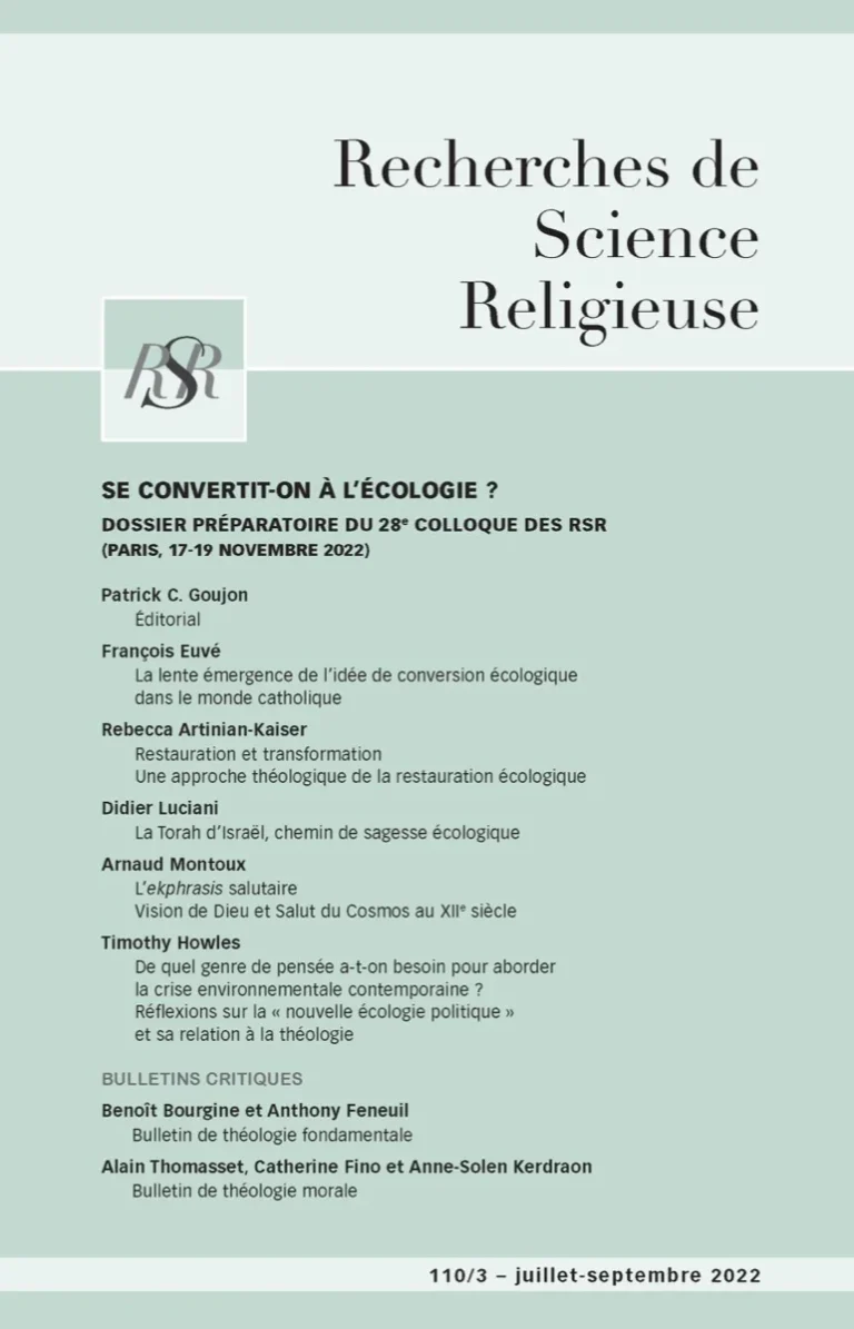 Nous interrogerons la pertinence de la notion théologique de conversion quant à l’écologie alors même qu’est reconnue la nécessité de transformer radicalement nos modes de vie. Il fallait d’abord que ce numéro préparatoire au colloque établisse un état de la question, sans se perdre dans l’immense bibliographie et les nombreuses problématiques liées à la crise écologique. D’une certaine manière, d’autres numéros nous ont déjà portés sur ce terrain, en particulier en 2019, le volume intitulé « Repenser la création à l’âge de l’anthropocène » (tome 107/4), et les deux livraisons de 2020 « Vivre le temps de l’histoire », consacré l’un à l’apocalyptique l’autre à la sagesse. Si ces sujets ont été écartés de ce présent numéro et s’ils ne font pas l’objet de communication au colloque de novembre, c’est que le comité de rédaction a pensé la question de l’écologie sur cette longue période. C’est à François Euvé, qui avec Jean-Louis Souletie a élaboré ce dossier et ce projet de colloque avec l’ensemble du comité des RSR, que revenait d’exposer l’histoire théologique de la notion de conversion dans le premier article, « La lente émergence de l’idée de conversion écologique dans le monde catholique ». La question a été posée il y a près de cinquante ans, en bonne part pour réagir aux attaques de Lynn T. White qui rendait le christianisme occidental largement responsable de la crise écologique. Le discours magistériel s’est transformé, mesurant la nécessité d’une approche critique de l’anthropocentrisme encore tranquillement affirmé à Vatican II, mais insuffisante pour penser ce qui était nécessaire pour affronter la crise écologique, à la fois au plan d’une théologie de la Création, et à son articulation au salut, et en ce qui concerne une réflexion morale et spirituelle sur les dynamiques de conversion, comme le donnera à lire l’article de Rebecca Artinian-Kaiser, « Restauration et transformation. Une approche théologique de la restauration écologique », qui fait le point sur les modèles de conversion proposés (en interrogeant particulièrement celui de restauration), se pose fondamentalement la question du statut des acteurs de la transformation, de l’échelle de leur implication (de son jardin privé à l’action politique globale), du rapport à l’histoire qui s’y joue (restaurer le passé, rendre possible l’avenir), à l’espace et à son occupation, de leur conception de l’action. Enracinée dans la théologie anglophone, Rebecca Artinian-Kaiser, du Laudato si’ Research Institute de l’Université d’Oxford, fait entendre l’importance de la foi en la résurrection et d’une théologie de l’amour pour forger une sagesse propre à participer à la conversion écologique requise de tous. Le lien à la Sagesse est également au cœur de l’étude que propose Didier Luciani, de l’Université Catholique de Louvain-la-Neuve, « La Torah d’Israël, chemin de sagesse écologique ». Outre une précieuse clarification de ce que l’étude des Écritures peut apporter à la réflexion sur la crise écologique, celle-ci ne faisant pas partie de l’horizon biblique, l’auteur s’en tient à l’analyse de deux chapitres du Lévitique, déterminants pour comprendre l’association de la clameur de la terre à la clameur des pauvres dans Laudato si’ (§49). Ne pas moissonner tout le champ ni tout le temps et préserver un espace à glaner pour le plus pauvre sont loin de s’imposer comme des solutions techniques à des problèmes de gestion des ressources et des approvisionnements. En faisant face à la tentation de la jouissance et de l’exploitation exclusive, la Loi ouvre un chemin de sagesse pour honorer Dieu et prendre soin du pauvre et de l’étranger. L’instauration de l’année sabbatique, inscrivant la pratique de la jachère dans le temps long des générations, conduit celui qui obéit à la Loi à s’interroger sur son rapport à la terre, à la considérer comme partenaire de l’alliance entre Dieu et l’homme. Le lecteur trouvera sans peine ici des éléments fondamentaux pour revenir à ce déplacement suggéré par le Pape François pour agir au sein de la nécessaire conversion écologique comme partenaire de l’alliance avec Dieu. Par un autre biais, la question de l’action et du statut des acteurs des transformations écologiques reviendra dans l’article de Timothy Howles, lui aussi du Laudato si’ Research Institute d’Oxford, centre de recherches de nos confrères jésuites de Campion Hall, qu’il consacre largement à la pensée de Bruno Latour. Comment la crise écologique est-elle une invitation à repenser politiquement et théologiquement la relation de l’homme à la nature ? Il nous a paru nécessaire auparavant de faire un détour par le Moyen Âge. Nombreuses sont les tentatives en effet en théologie de revenir aujourd’hui vers la tradition patristique et médiévale pour y trouver de quoi proposer de nouvelles cosmologies théologiques. Arnaud Montoux, professeur au Theologicum de l’Institut Catholique de Paris, et spécialiste de théologie médiévale, se risque dans un essai à montrer comment la Création aspire au salut. Mais loin d’être saisie comme cosmos ordonné, la Création, telle qu’elle est analysée par l’auteur à partir de représentations architecturales et de visions de mystiques du XIIe siècle, aspire au Salut dans sa matière chaotique même. Est suggérée pour aujourd’hui une posture théologique et poétique qui ne manquera pas d’interroger notre rapport à la matérialité et au monde que postulent les sciences et l’action telles que nous les avons dorénavant organisées.
