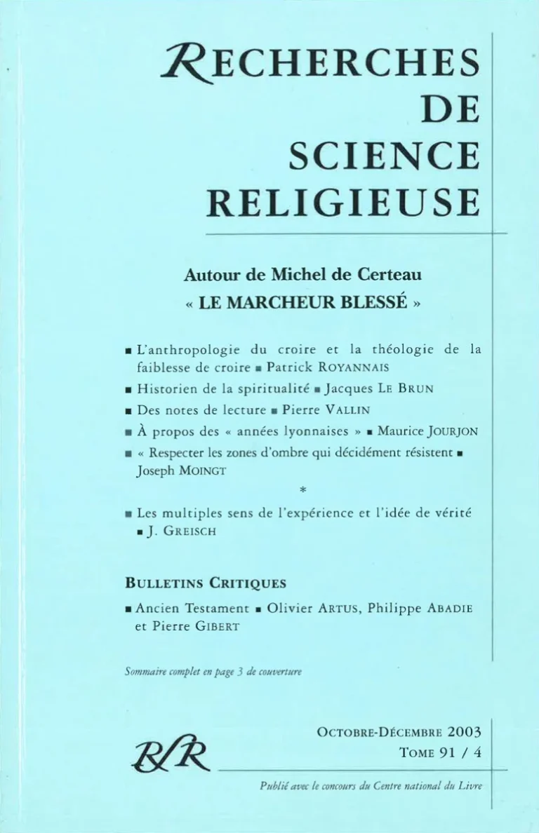 Grâce notamment à la biographie de Fr. Dosse, l’article d’un jeune théologien lyonnais, Patrick Royannais, nous permet de proposer un « Autour de Michel de Certeau » qui n’a nullement la prétention de refaire ni même de compléter le travail magistral de la revue dans le numéro double qu’elle lui consacra deux ans après sa mort sous le titre « Le voyage mystique » (RSR 1988 76/2-3). Il s’agit tout au plus de saisir l’occasion de quelques publications en français comme en allemand pour rappeler ce que nous devons aujourd’hui encore à une pensée et une œuvre qui ne restent pas seulement témoin d’un enthousiasme ; c’est aussi et surtout une œuvre de passion, dans tous les sens du terme. Que P. Royannais revienne sur une dimension de cette pensée et de cette œuvre, facilement négligée ou occultée, la dimension théologienne, ne peut que confirmer un peu plus ce « passant » que fut parmi nous Michel de Certeau dans ses lumières autant que dans ses questionnements.